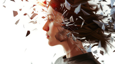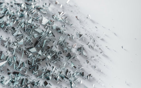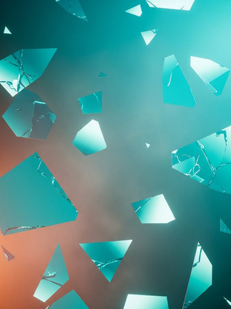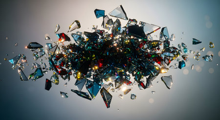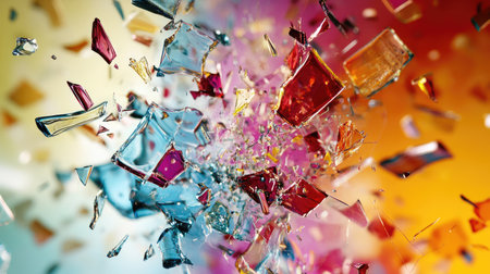 Shattered glass fragments in vibrant tones, creating an abstract explosion in a minimalist scene.