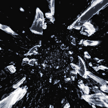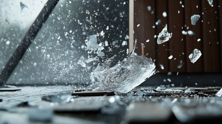 Shards of shattered glass fly through the air against a dark backdrop, capturing the moment of impact and chaos.