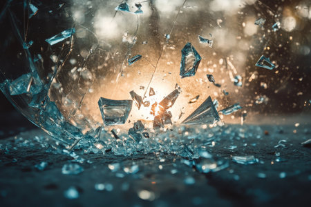This captivating image showcases the moment of glass shattering upon impact, producing intricate fragments and reflections. The dynamic scene captures energy and beauty in chaos.