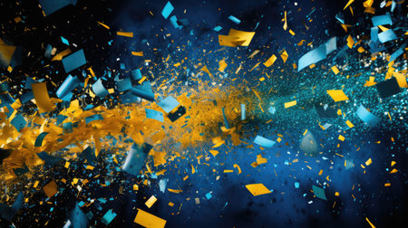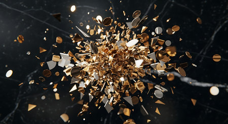 Abstract gold explosion dark marble background geometric shapes scattered golden fragments art design elegant backdrop.