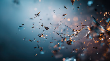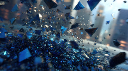 Shattered glass with suspended flying shards and dramatic motion blur on blue background for impactful breakage and destruction concept.
