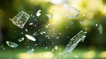 An artistic capture of shattered glass fragments suspended in mid-air, illuminated by soft natural light, creating a mesmerizing display of chaos and clarity in nature.