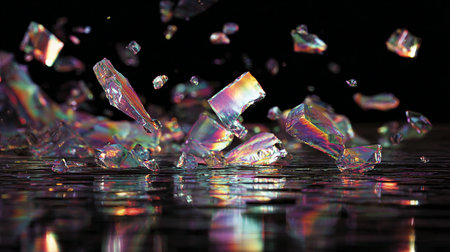 An artistic depiction of shattered glass pieces suspended in vibrant light, showcasing dynamic movement and colorful reflections in an abstract scene.
