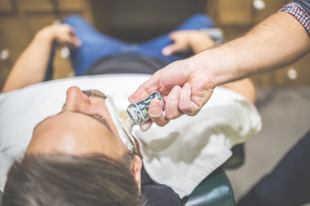 Hairdresser applying shaving foam on clients beard before shaving in barber shop