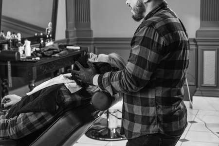 Hipster client visiting barber shop. Bearded male sitting in an armchair in a barber shop while hairdresser shaves his beard with a dangerous razor. Stylish Vintage Barber Interior.