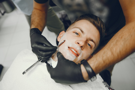 Shave a man in a barbershop. Shave a dangerous razor.