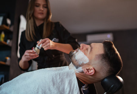 Young longhaired female Barber gently applies shaving cream foam on bearded man's face bristle while he lying in barbershop comfortable chair. Hair and skin care service, local small business concept