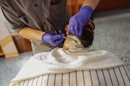 Professional stylist and hairdresser carefully shaving a beard of his client with sharp blade and black gloves.