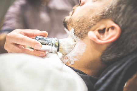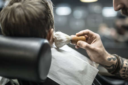 Brush for applying foam on beard man shaving with razor in barbershop background of tools.