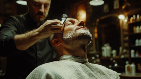 A skilled barber expertly shaves a clients face in a vintage-style barbershop during the evening hours
