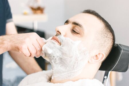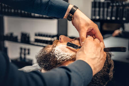 Bearded male sitting in an armchair in a barber shop while hairdresser shaves his beard with a dangerous razor.