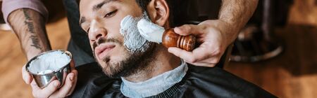 panoramic shot of barber applying shaving cream on face of handsome bearded man