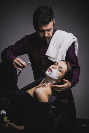 Hair Stylist and Barber. Woman and man playing domination games. Razor blade. Ideas about Barbershop and Barber salon. Great time at barbershop. Portrait bearded man.