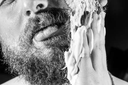 a man young in shaving foam, preparing to remove hair, part of a face close-up, black and white photo