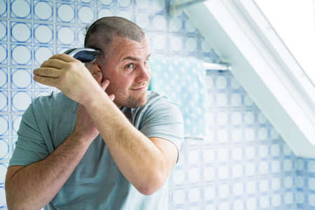 A man of fourty years old staying in a bathroom and shaving himself with electronic razor, taking care of himself during coronavirus lockdown and hairdresser salons closed. Father cutting himself hair with clipper at home.
