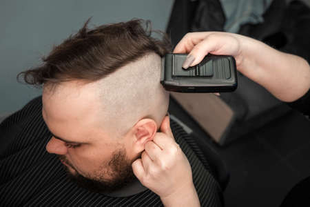 Man being trimmed with professional electric clipper machine in barbershop.Male beauty treatment concept.