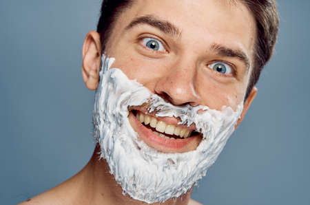 Health beauty and skin care concept. Closeup young bearded man with foam on face shaving on blue background.