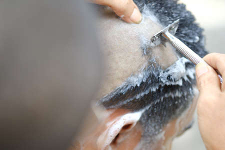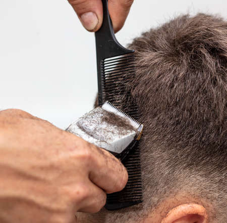 Male shaving or trimming his hair using a hair clipper or electric razor