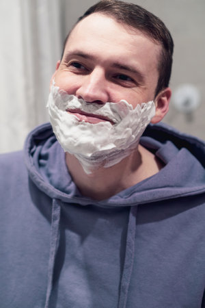 Man with lots of shaving foam on his face standing in bathroom, looking at mirror, shaving his face beard. Skincare