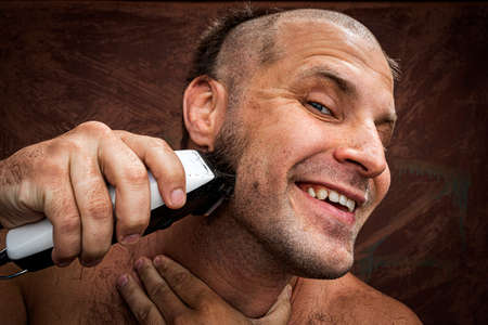 Close-up portrait of handsome shirtless man shaving his head with an electric razor and smilling, against brutal background. concept of male home care without beauty salons
