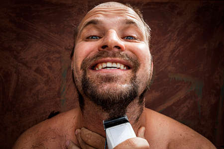Close-up portrait of handsome shirtless man shaving his beard with an electric razor and gritting his teeth, against brutal background. concept of male home care without beauty salons