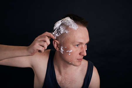 confident man of brutal Caucasian appearance, doing a haircut of his beard and hair on his head. dangerous razor blade shaving foam. shaving the head bald