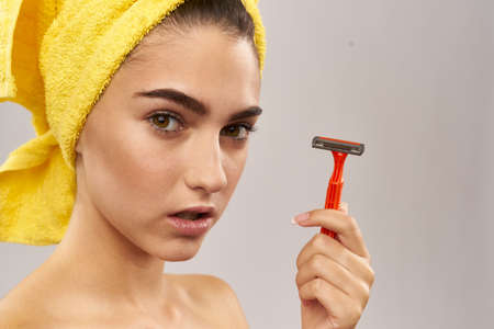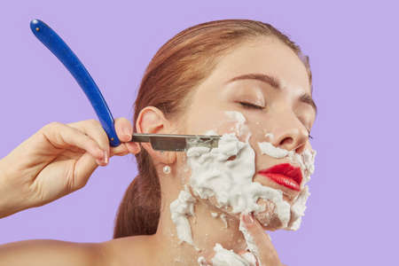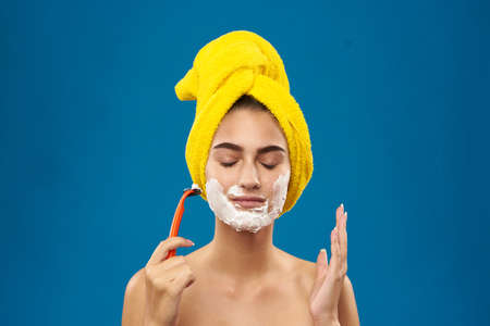 woman with trendy makeup. girl with fashion hair. woman shaving with foam and razor blade. morning grooming and skincare. pretty girl in bath. morning shaving for real woman.