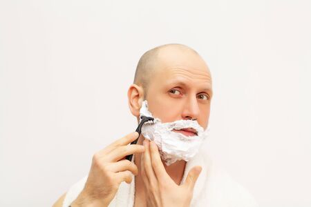 Bearded man shaving with razor in the morning. Isolated over white background.