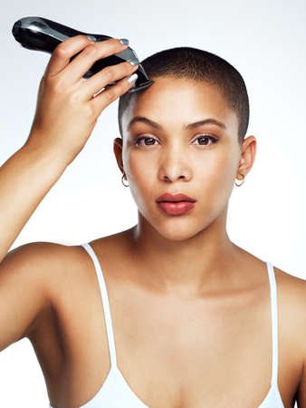 Bald is the new beautiful. Studio shot of a beautiful young woman shaving her head against a white background.