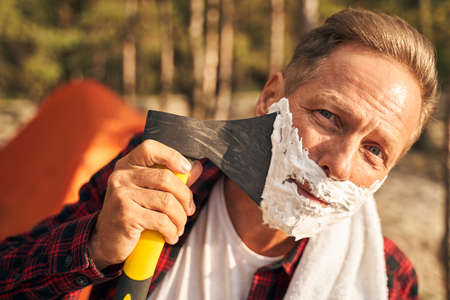 Portrait of handsome white-haired beared middle-aged man applying shaving foam to trim his beard