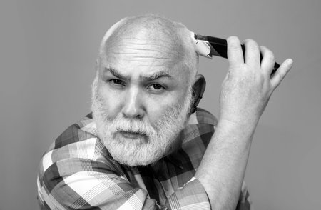 Senior hair clippings. Bald man hairclipper, Mature baldness and hair loss concept.