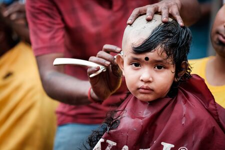 Close-up of baby boy devotee getting tonsured or head shaving ritual in Thaipusam Festival.