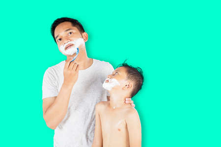 Father and his little son shaving beard together while standing in the studio with green screen background