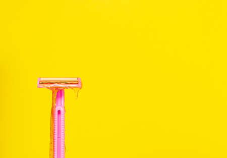 The concept of hair removal, sugaring, wax. Beauty salon, Spa treatments. Shaving vs hair removal. Sugar depilatory paste runs down a pink razor on a yellow background. Copyspace.