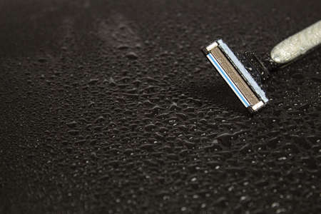 Razor with drops of water on a black background. Top view. Skin care concept.