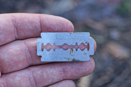 Old razor blade in the hand. Shallow depth of field.