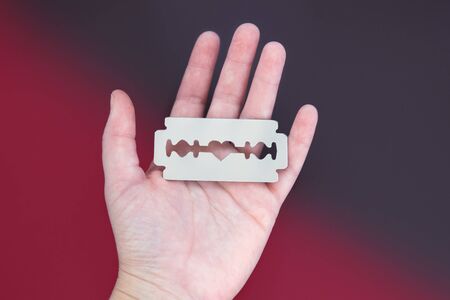A big plastic razor blade on a female palm on a blurred red and brown background