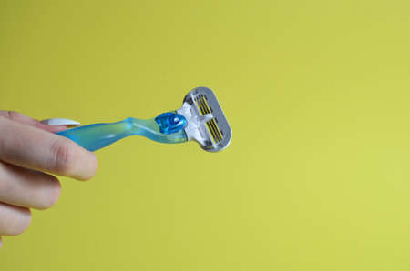female shaving machine blue on a yellow background. Women's shaving concept