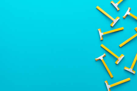Many disposable unisex razors on the turquoise blue