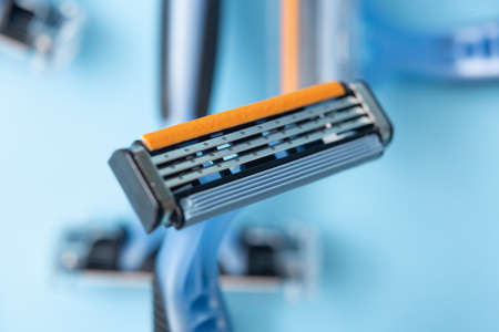Plastic razor on blue background. The concept of using a razor. Razor device. The concept of skin care. Epilation hair removal. Orange men's shaving razors, top view.