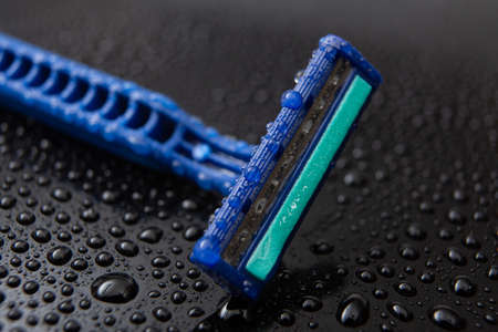 blue disposable razor blade, on black background with water drops