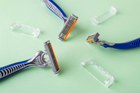 Three new disposable shaving razors with triple blade lie in a circle on a pastel green background. Silver blue plastic razor with orange lubricat strip. Personal hygiene accessory for man and woman.