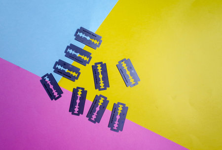 Razor blades piled on a blue background