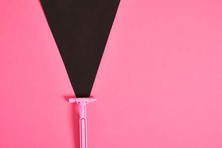 a pink plastic disposable razor and a black triangle made of paper on a pink background, an association on the theme of feminism and shaving hair from a female body