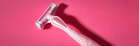 A single pink razor is positioned diagonally on a vibrant pink surface, with a distinct shadow cast to its right.