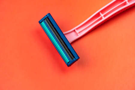 Pink razor on a red background at an angle, top view of the razor blades for design in your work.