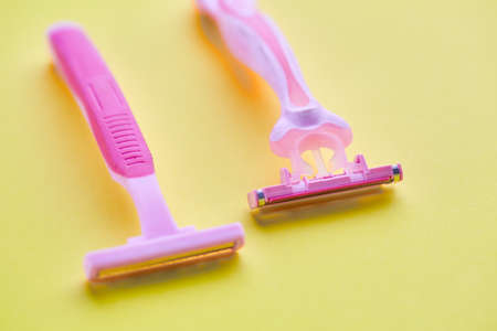Pink plastic razor on a yellow background. Top view