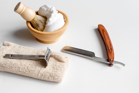 A razor and a brush with wooden handles and a foam bowl on a white table. Men's accessories for appearance care.