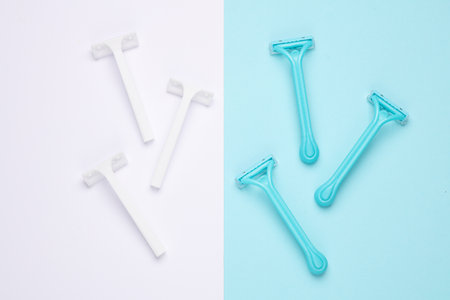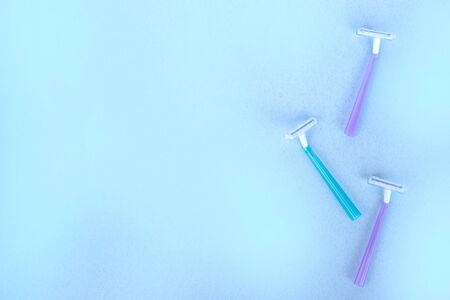 Disposable plastic razors on white blue background, beauty concept. Top view. Creative layout