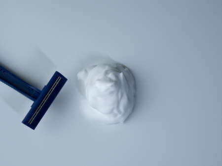 White shaving foam and razor on white background. Cosmetic for men. Studio closeup shot.